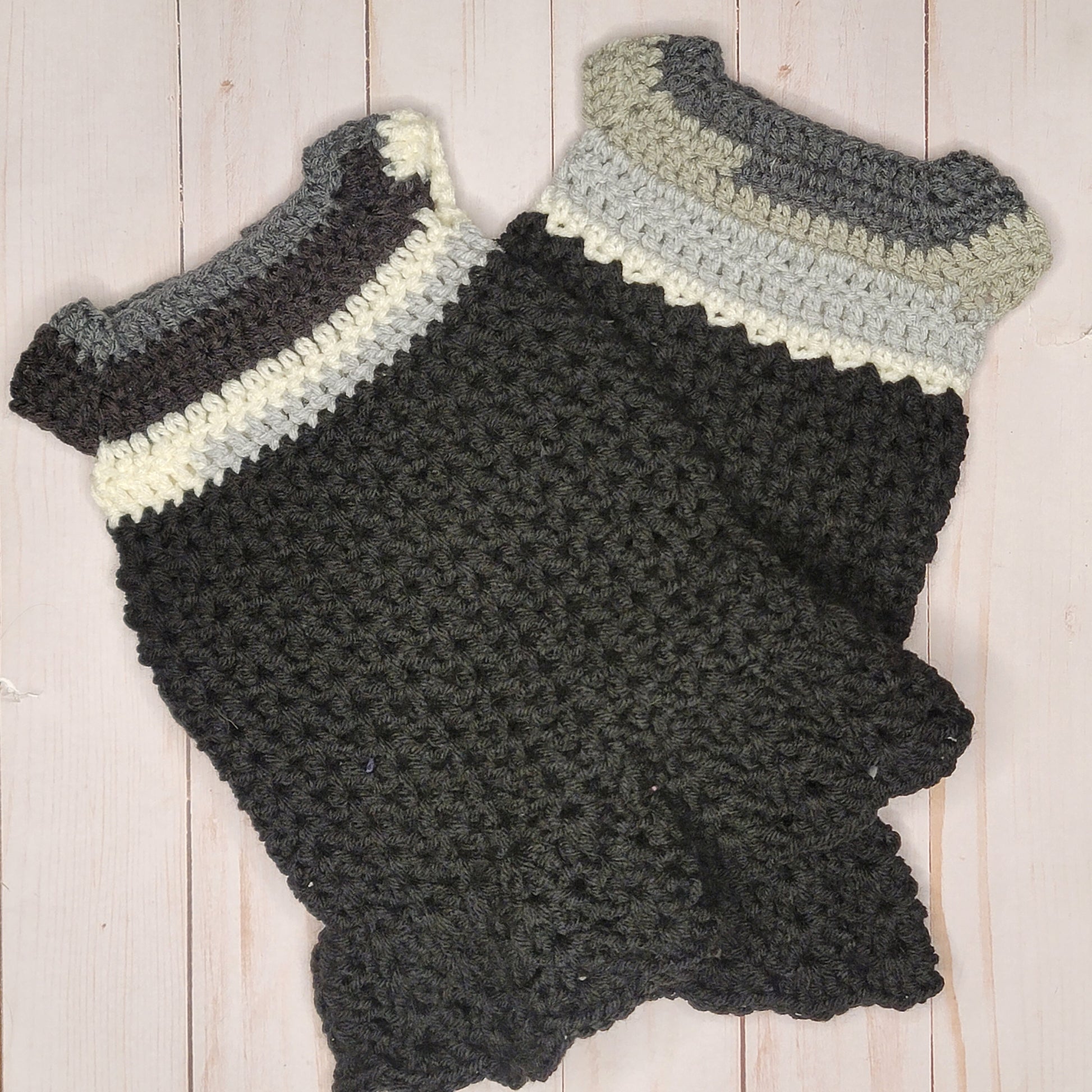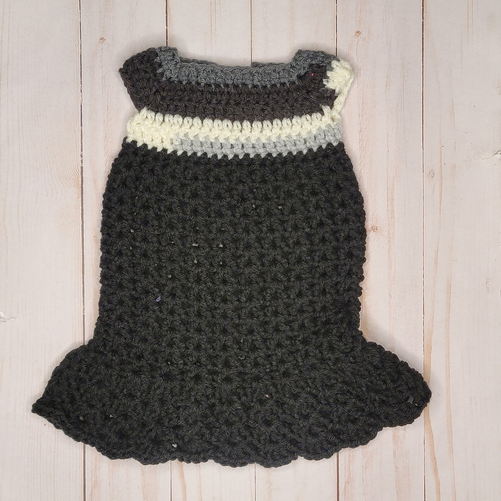 These handmade dresses are crafted with a unique variegated yarn for the bodice, making each top beautifully unique in color and pattern. Paired with a classic, solid black skirt, this stylish dress ties elegantly in the back with a coordinating 1/8-inch ribbon, adding an adorable finishing touch. Perfect for 18-inch dolls, this dress brings a touch of handmade charm to your doll’s wardrobe.